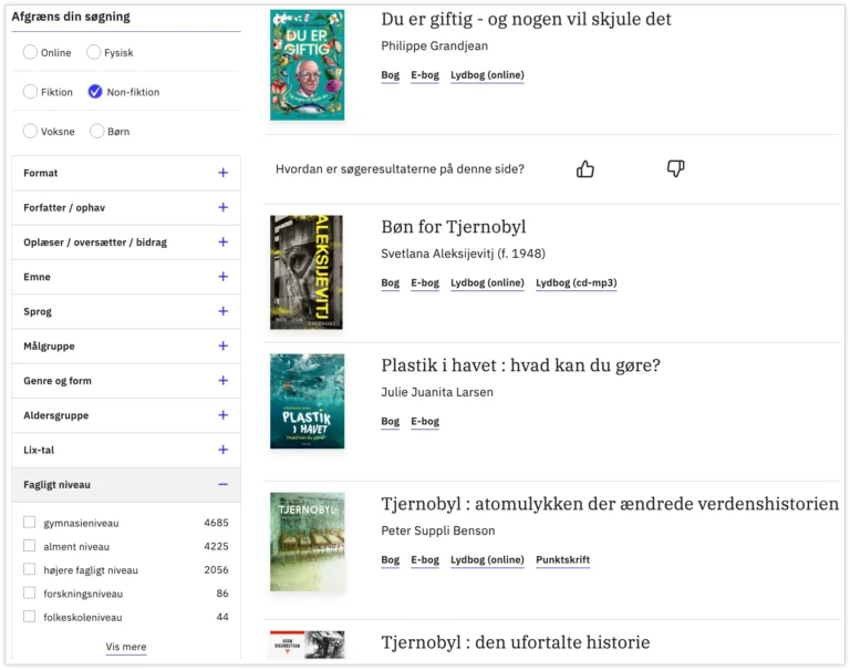 Det er muligt at afgrænse søgninger på forskellige former for faglitteratur til et bestemt fagligt niveau.