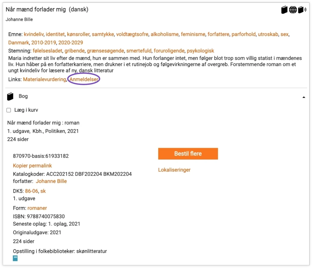 Den enkleste måde at finde anmeldelser af et værk på er normalt at søge værket frem og herefter klikke på Anmeldelser.
