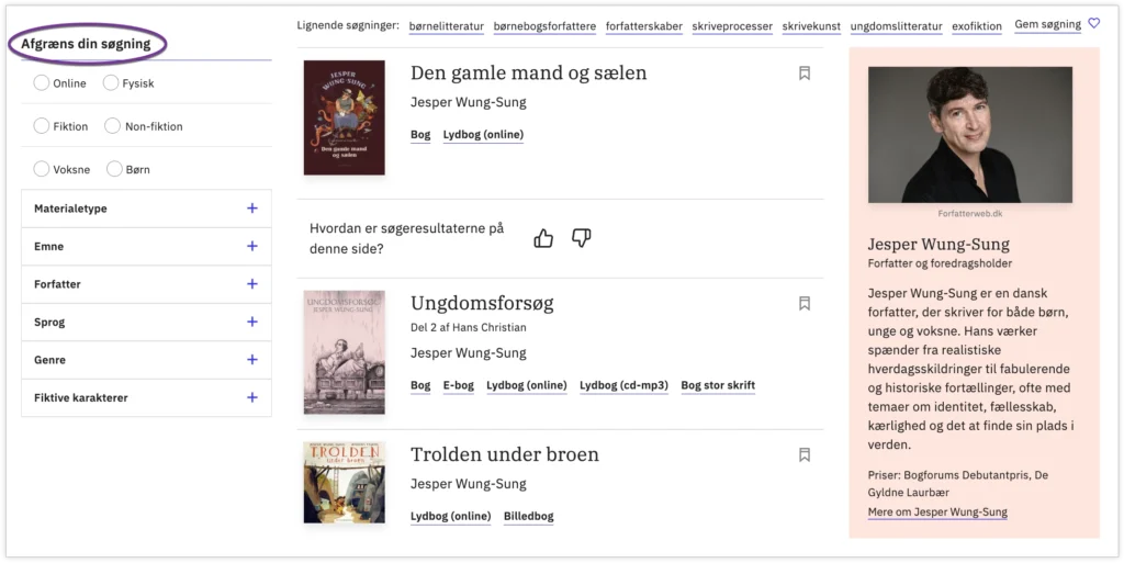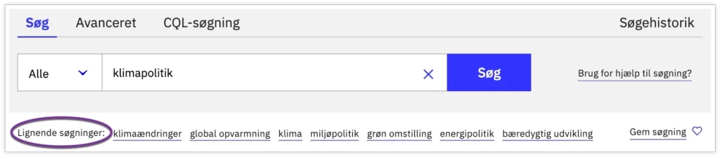 Øverst i resultaterne finder du ofte forslag til Lignende søgninger, som giver inspiration til andre relevante søgninger. Forslagene er baseret på emneord, der relaterer sig til de emneord, der findes i posterne. I andre tilfælde kommer Bibliotek.dk med et Mente du-forslag til en alternativ søgning.