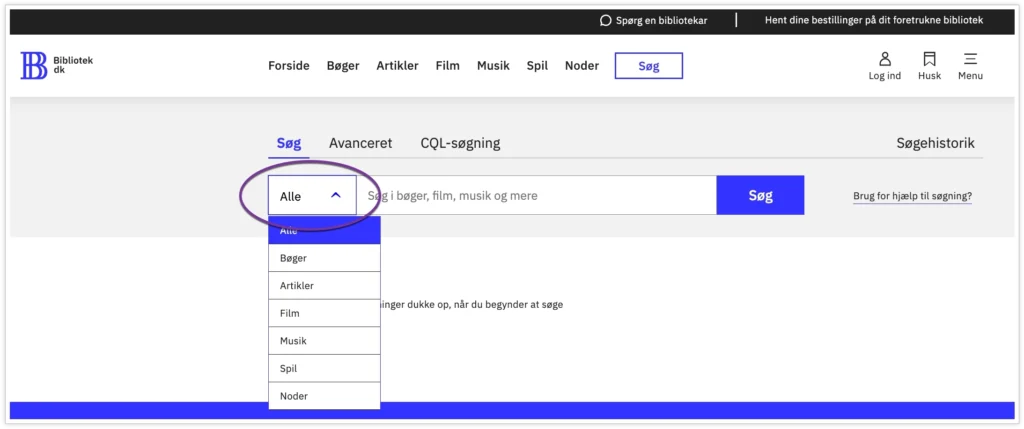 - Afgræns eventuelt søgningen inden start ved at vælge en materialetype i dropdown-menuen til venstre for søgefeltet.