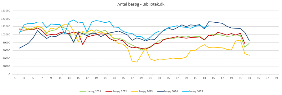 Besøgstal for Bibliotek.dk de seneste fem år.